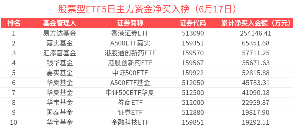 近5天主力資金累計淨買入超過1億元的股票型ETF基金有22只,金額居前的為香港證券ETF(513090), A500ETF嘉實(159351), 港股通創新藥ETF(159570), 港股創新藥ETF(159567), 中證500ETF(159922)分別淨買入25.41億元, 6.54億元, 5.77億元, 5.57億元, 5.28億元。其中,香港證券ETF近5天獲主力資金大幅淨買入。