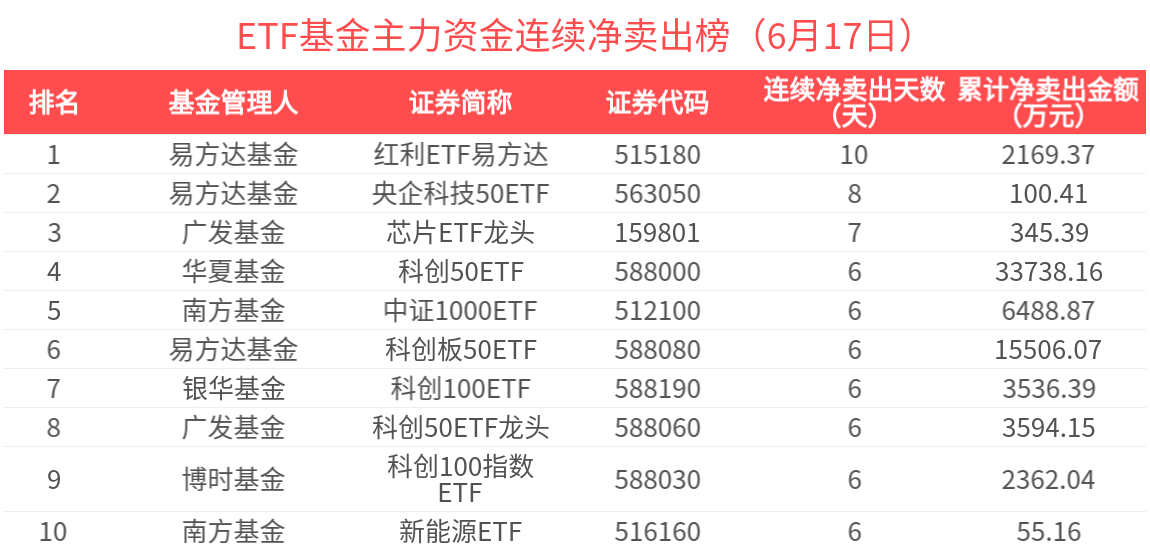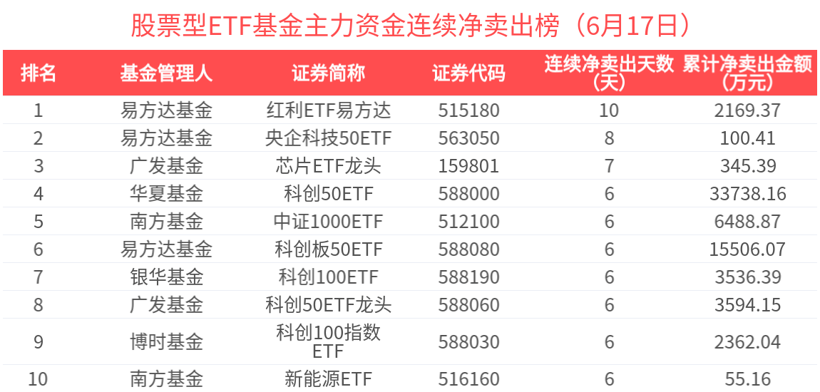 近期主力資金連續淨賣出的股票型ETF基金有75只,居前的為紅利ETF易方達(10天), 央企科技50ETF(8天), 芯片ETF龍頭(7天), 科創50ETF(6天), 中證1000ETF(6天)分別淨賣出1.05億元, 1862.70萬元, 2762.57萬元, 10.32億元, 5.40億元。其中,科創50ETF近6天遭主力資金加速賣出,近6天累計賣出10.32億元。