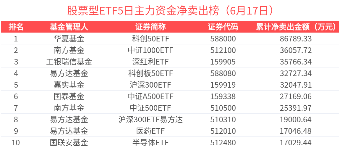 近5天主力資金累計淨賣出超過1億元的股票型ETF基金有16只,金額居前的為科創50ETF(588000), 中證1000ETF(512100), 深紅利ETF(159905), 科創板50ETF(588080), 滬深300ETF(159919)分別淨賣出8.68億元, 3.61億元, 3.58億元, 3.27億元, 3.20億元。其中,科創50ETF近5天遭主力資金大幅淨賣出。