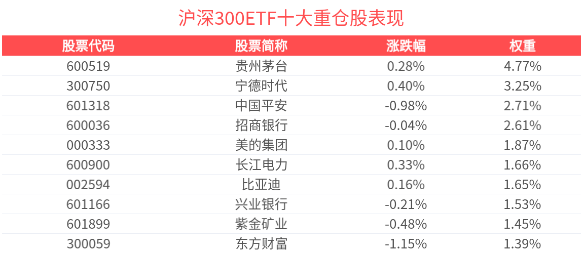數據顯示,截至2025年5月30日,滬深300指數前十大權重股分別為貴州茅台、寧德時代、中國平安、招商銀行、美的集團、長江電力、興業銀行、比亞迪、紫金礦業、東方財富,前十大權重股合計佔比23.22%。