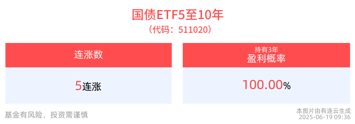 截至2025年6月19日 09:36,國債ETF5至10年(511020)上漲0.03%, 沖擊5連漲。最新價報117.64元。拉長時間看,截至2025年6月18日,國債ETF5至10年近3月累計上漲1.80%。