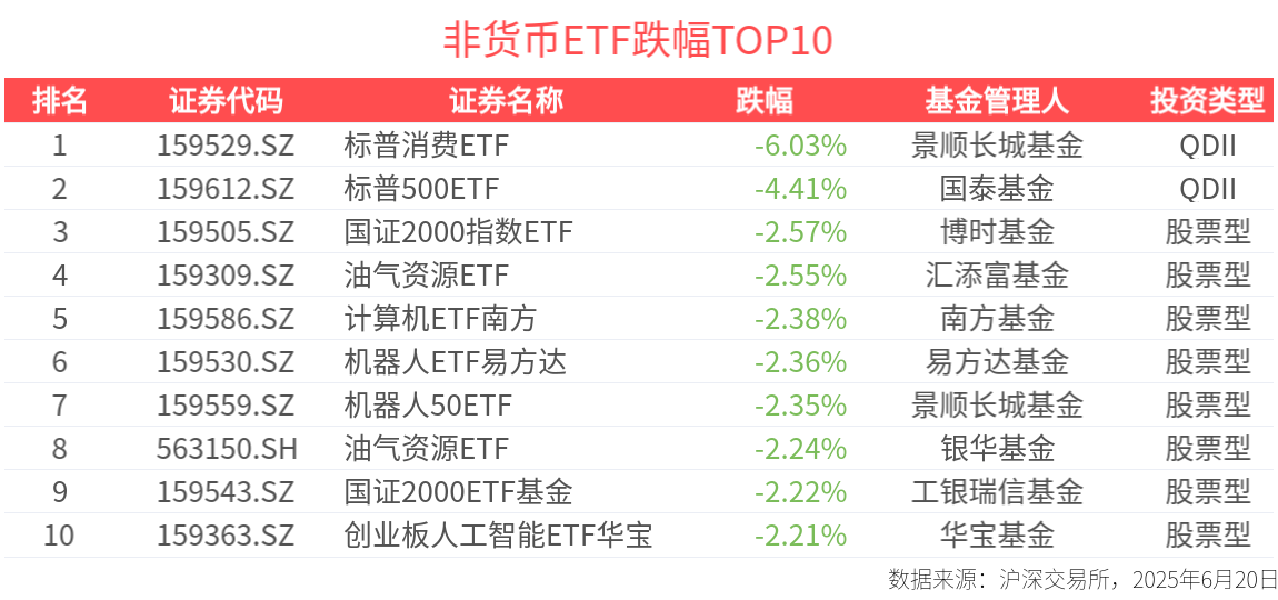 截至今日收盤,全市場共計653只非貨ETF下跌,下跌比例達56%。寬指方面,國證2000指數今天表現靠後,下跌0.83%;行業主題指數方面,國證機器人産業指數、中證全指計算機指數跌幅居前,分別下跌2.52%、2.32%。
