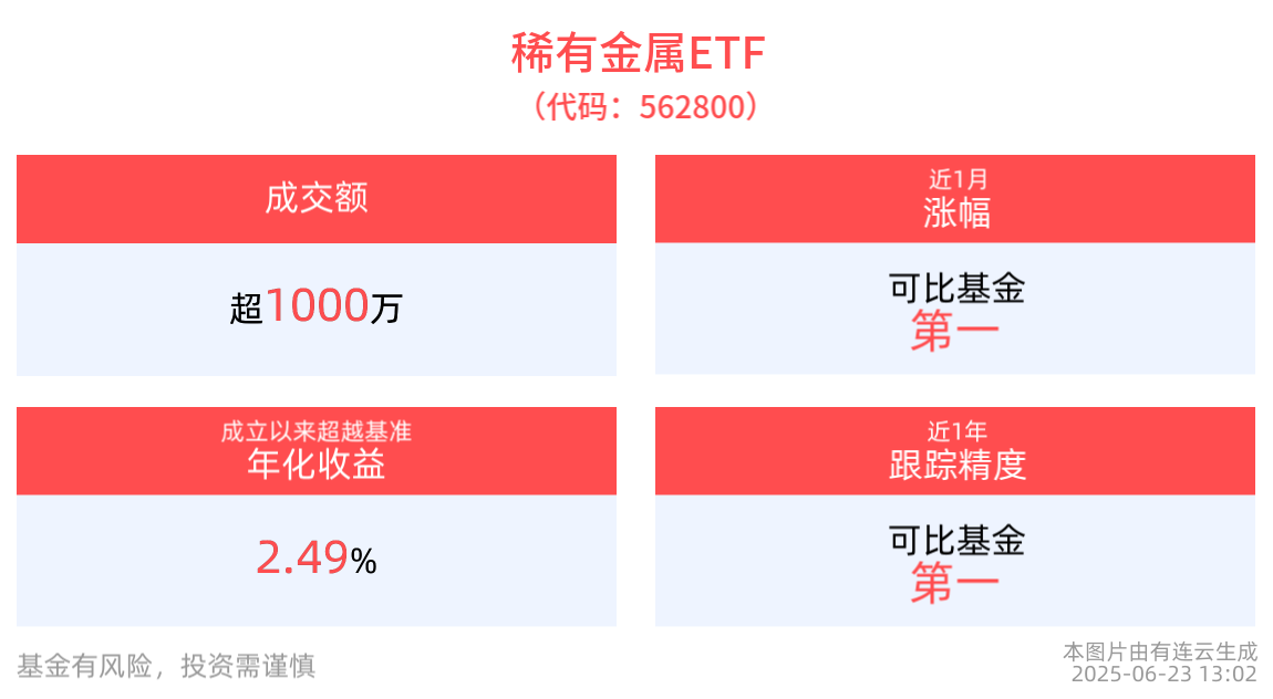 截至6月20日,稀有金屬ETF近1年淨值上漲14.67%。從收益能力看,截至2025年6月20日,稀有金屬ETF自成立以來,最高單月回報為24.02%,最長連漲月數為3個月,最長連漲漲幅為14.06%,上漲月份平均收益率為7.60%。