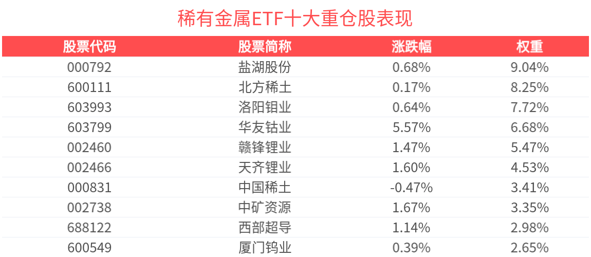 數據顯示,截至2025年5月30日,中證稀有金屬主題指數前十大權重股分別為鹽湖股份、北方稀土、洛陽鉬業、華友钴業、贛鋒鋰業、天齊鋰業、中國稀土、西部超導、中礦資源、廈門鎢業,前十大權重股合計佔比54.9%。