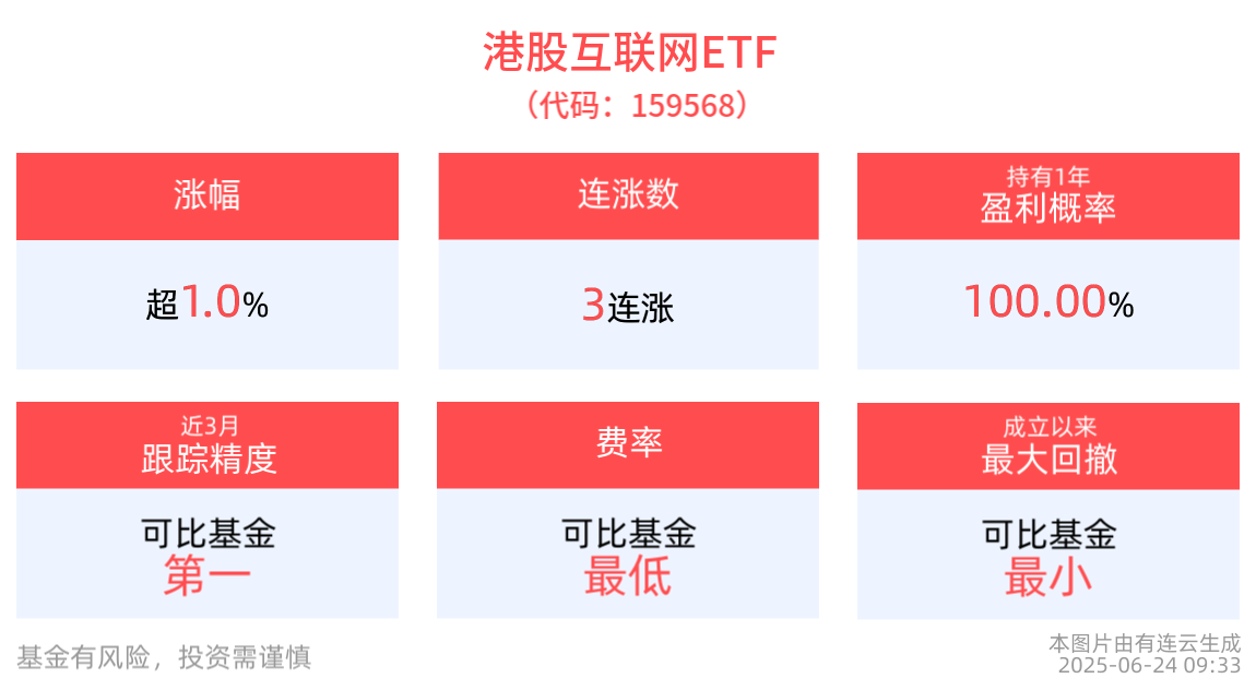 跟蹤精度方面,截至2025年6月23日,港股互聯網ETF近3月跟蹤誤差為0.050%,在可比基金中跟蹤精度最高。