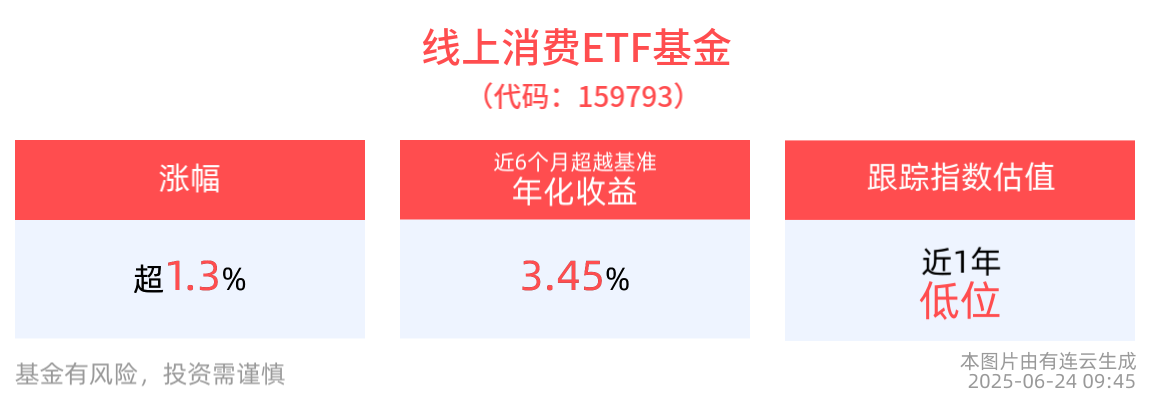 截至2025年6月24日 09:45,中證滬港深綫上消費主題指數(931481)強勢上漲1.23%,成分股掌趣科技(300315)上漲6.26%,巨人網絡(002558)上漲4.26%,順網科技(300113)上漲3.11%,神州泰嶽(300002),華策影視(300133)等個股跟漲。綫上消費ETF基金(159793)上漲1.34%,最新價報0.91元。