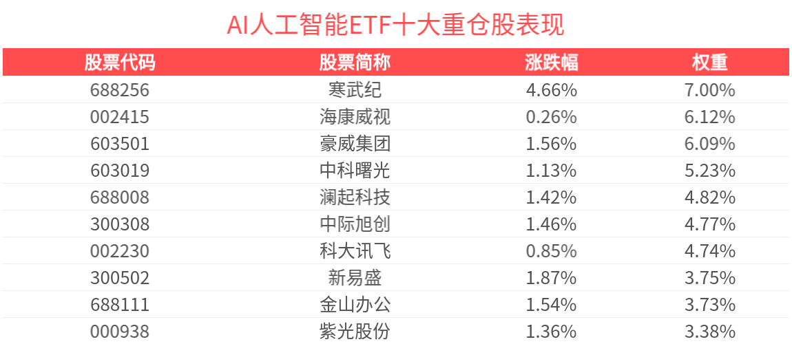 數據顯示,截至2025年5月30日,中證人工智能主題指數(930713)前十大權重股分別為寒武紀(688256)、豪威集團(603501)、海康威視(002415)、中科曙光(603019)、新易盛(300502)、瀾起科技(688008)、科大訊飛(002230)、中際旭創(300308)、金山辦公(688111)、紫光股份(000938),前十大權重股合計佔比51.56%。