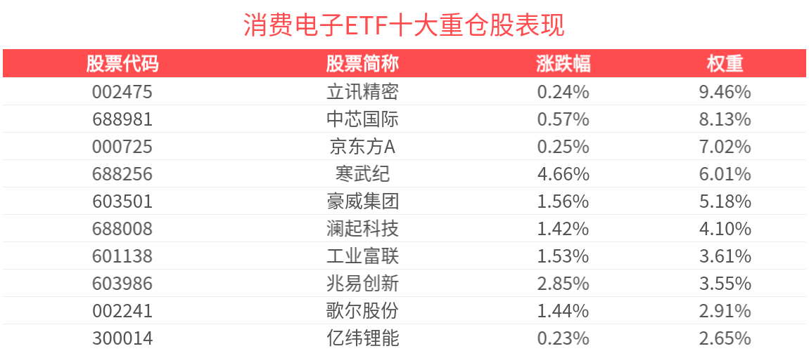 數據顯示,截至2025年5月30日,中證消費電子主題指數(931494)前十大權重股分別為中芯國際(688981)、立訊精密(002475)、京東方A(000725)、寒武紀(688256)、豪威集團(603501)、瀾起科技(688008)、工業富聯(601138)、兆易創新(603986)、億緯鋰能(300014)、歌爾股份(002241),前十大權重股合計佔比53.04%。