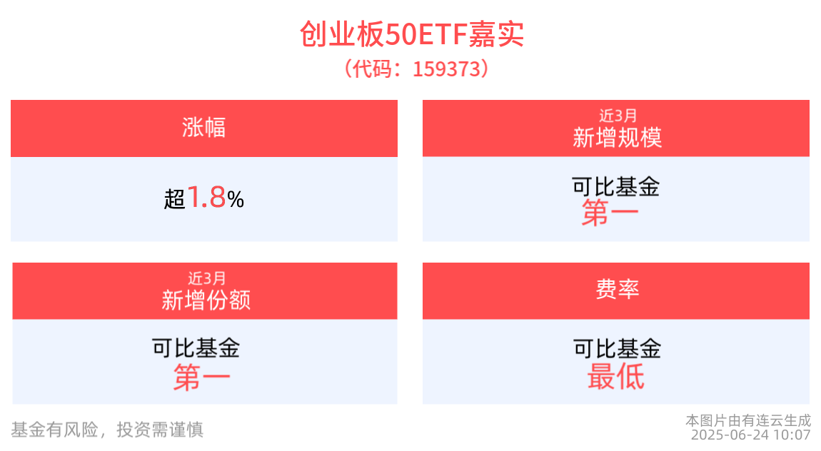截至2025年6月24日 10:07,創業板50指數強勢上漲1.87%,成分股指南針上漲9.95%,同花順上漲4.26%,東方財富上漲3.58%,神州泰嶽、中科創達等個股跟漲。創業板50ETF嘉實(159373)上漲1.89%。