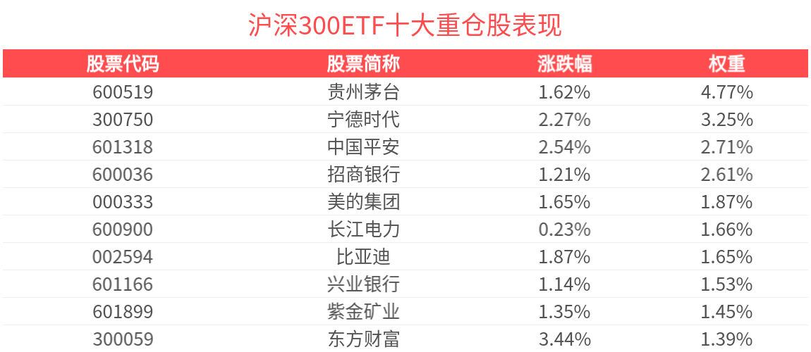 數據顯示,截至2025年5月30日,滬深300指數前十大權重股分別為貴州茅台、寧德時代、中國平安、招商銀行、美的集團、長江電力、興業銀行、比亞迪、紫金礦業、東方財富,前十大權重股合計佔比23.22%。