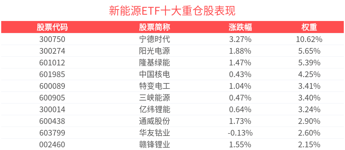 數據顯示,截至2025年5月30日,中證新能源指數前十大權重股分別為寧德時代、陽光電源、隆基綠能、中國核電、三峽能源、特變電工、億緯鋰能、華友钴業、通威股份、贛鋒鋰業,前十大權重股合計佔比44.89%。