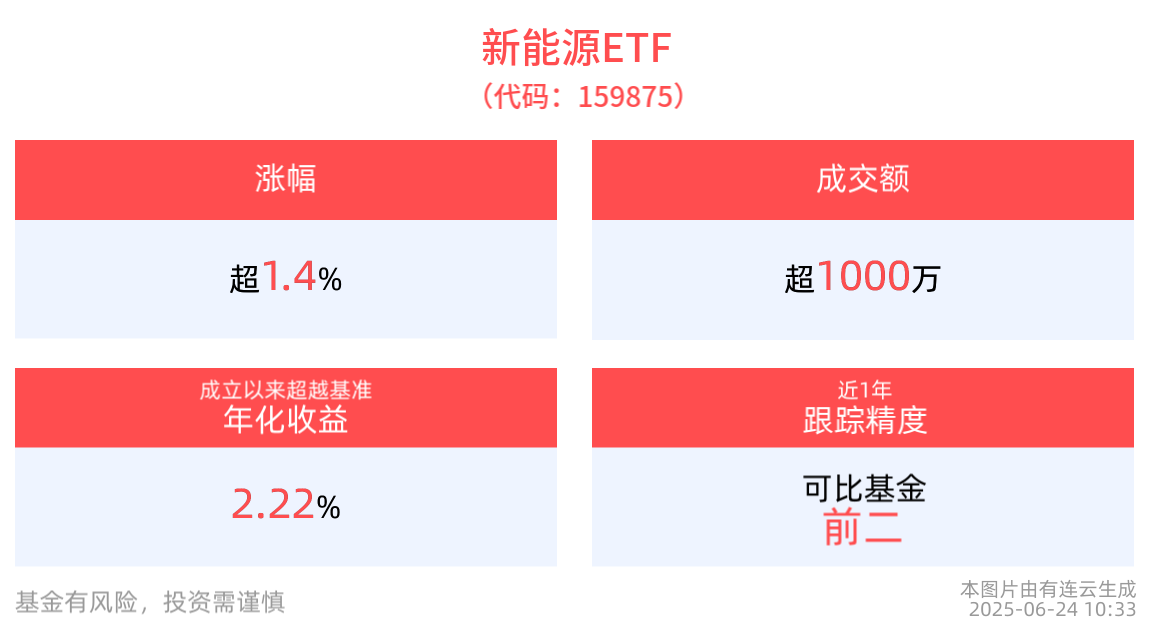 截至2025年6月24日 10:33,中證新能源指數強勢上漲1.54%,成分股湖南裕能上漲5.26%,中偉股份上漲3.65%,錦浪科技上漲3.63%,中國寶安、天賜材料等個股跟漲。新能源ETF(159875)上漲1.41%。