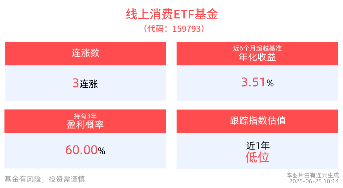 截至2025年6月25日 10:14,中證滬港深綫上消費主題指數(931481)上漲0.51%,成分股衛寧健康(300253)上漲3.73%,網易雲音樂(09899)上漲1.91%,哔哩哔哩-W(09626)上漲1.87%,高鑫零售(06808)上漲1.61%,阿裡巴巴-W(09988)上漲1.51%。綫上消費ETF基金(159793)上漲0.33%,最新價報0.92元。