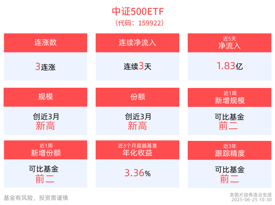截至6月24日,中證500ETF近5年淨值上漲10.29%。從收益能力看,截至2025年6月24日,中證500ETF自成立以來,最高單月回報為23.90%,最長連漲月數為13個月,最長連漲漲幅為160.72%,上漲月份平均收益率為5.49%。