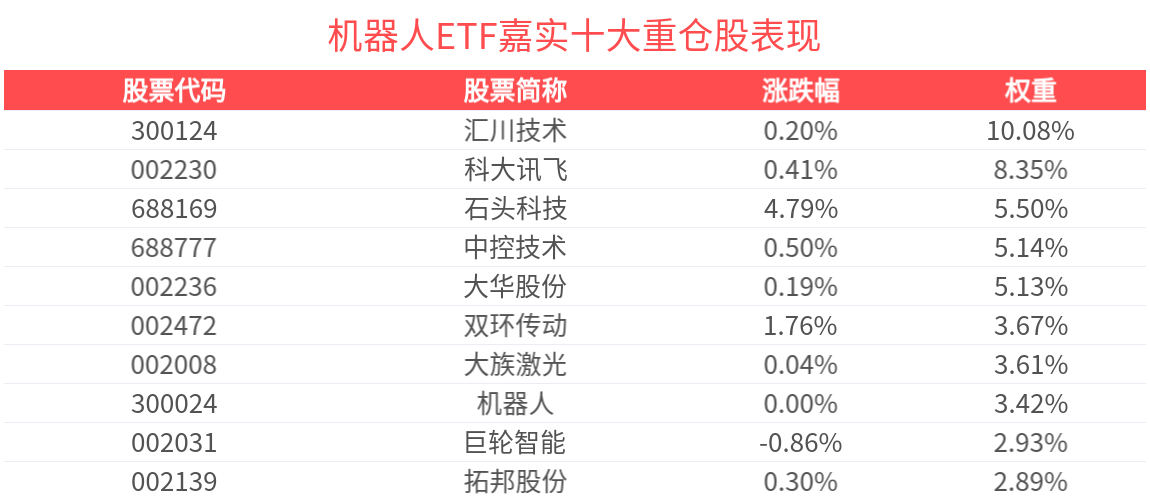 數據顯示,截至2025年5月30日,中證機器人指數前十大權重股分別為匯川技術、科大訊飛、石頭科技、大華股份、中控技術、雙環傳動、機器人、大族激光、巨輪智能、拓邦股份,前十大權重股合計佔比50.96%。