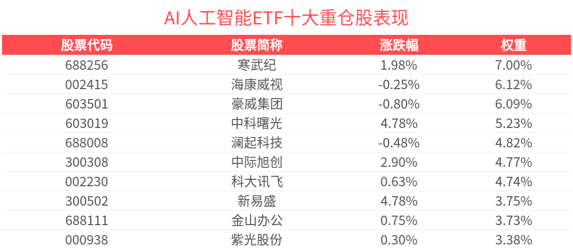 數據顯示,截至2025年5月30日,中證人工智能主題指數(930713)前十大權重股分別為寒武紀(688256)、豪威集團(603501)、海康威視(002415)、中科曙光(603019)、新易盛(300502)、瀾起科技(688008)、科大訊飛(002230)、中際旭創(300308)、金山辦公(688111)、紫光股份(000938),前十大權重股合計佔比51.56%。