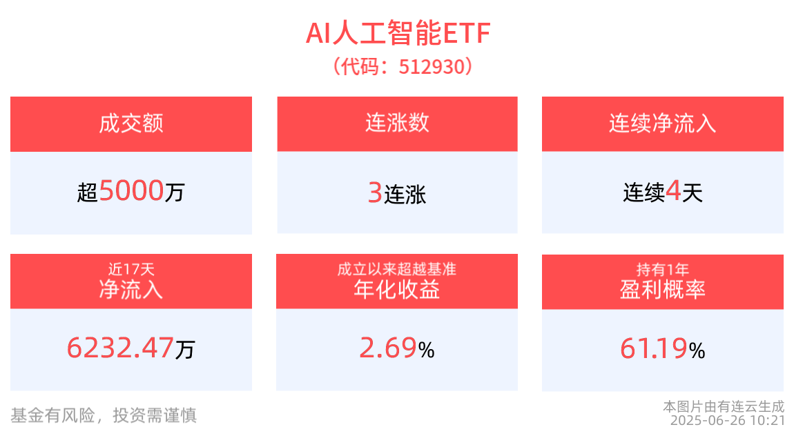 截至2025年6月26日 10:21,中證人工智能主題指數(930713)上漲0.85%,成分股新易盛(300502)上漲4.78%,中科曙光(603019)上漲4.78%,中際旭創(300308)上漲2.90%,石頭科技(688169)上漲2.78%,景嘉微(300474)上漲2.33%。AI人工智能ETF(512930)上漲0.89%, 沖擊3連漲。