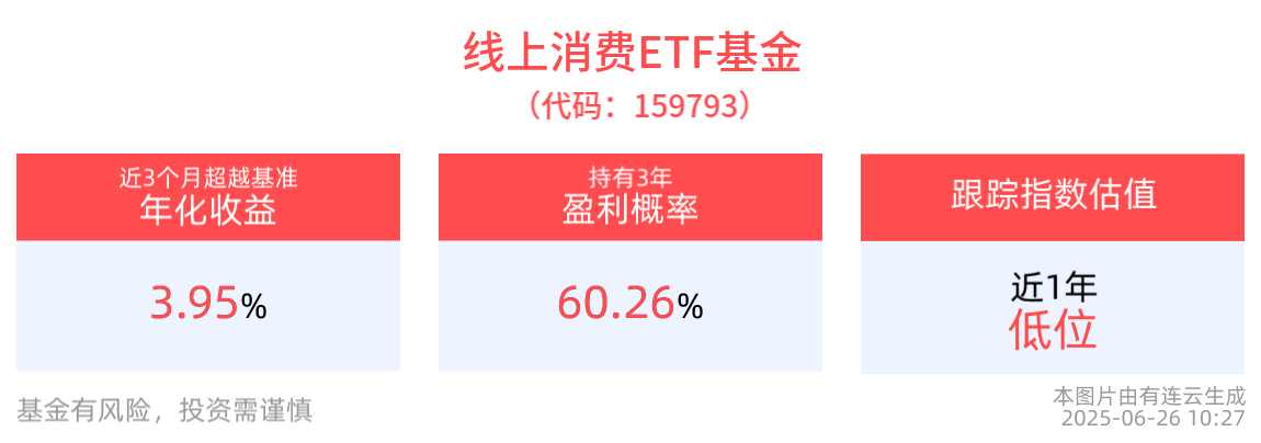 綫上消費ETF基金緊密跟蹤中證滬港深綫上消費主題指數,中證滬港深綫上消費主題指數從内地與香港市場中選取50只主營業務涉及綫上購物、數字娛樂、在綫教育以及遠程醫療等領域上市公司證券作為指數樣本,以反映内地與香港市場綫上消費主題上市公司證券的整體表現。