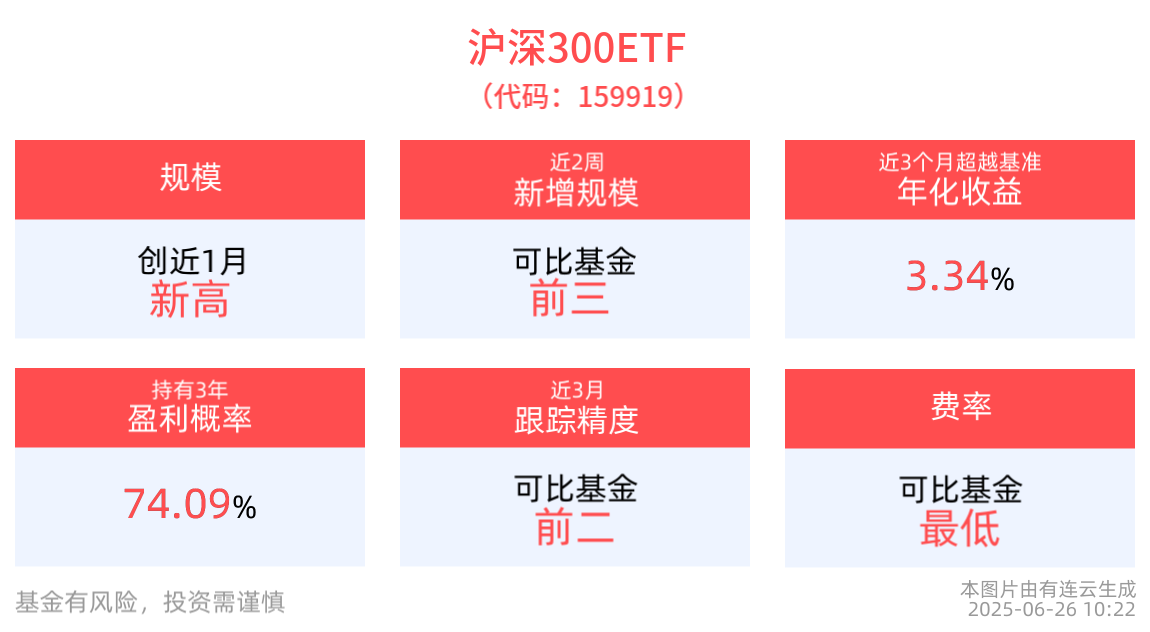 流動性方面,滬深300ETF盤中成交2.18億元。拉長時間看,截至6月25日,滬深300ETF近1年日均成交12.24億元,排名可比基金前3。