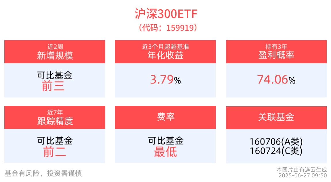 截至2025年6月27日 09:50,滬深300指數上漲0.27%,成分股洛陽鉬業上漲5.44%,江西銅業上漲4.59%,銅陵有色上漲4.04%,雲鋁股份上漲3.35%,紫金礦業上漲3.32%。滬深300ETF(159919)上漲0.32%。拉長時間看,截至2025年6月26日,滬深300ETF近1周累計上漲2.93%。
