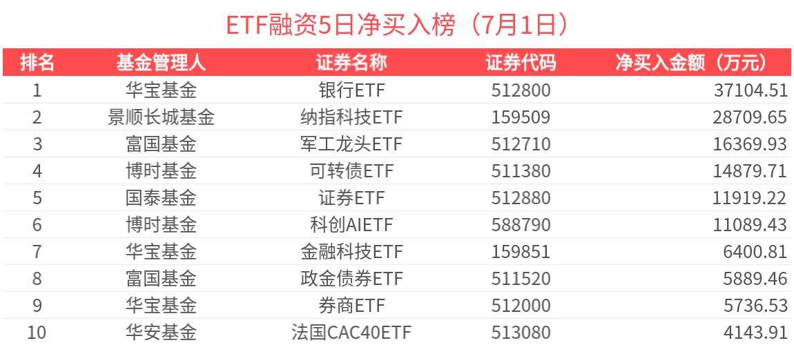 2025年7月1日,共171只ETF基金獲融資淨買入,38只ETF基金融券淨賣出。融資淨買入金額超500萬元的有27只,可轉債ETF(511380.SH)、納指科技ETF(159509.SZ)、港股創新藥ETF(513120.SH)、軍工龍頭ETF(512710.SH)、港股通互聯網ETF(159792.SZ)槓桿資金顯著流入,分別淨流入1.97億元、1.16億元、1.12億元、5631.86萬元、4481.97萬元。