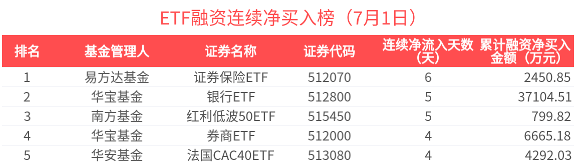 近期獲槓桿資金連續融資淨買入的ETF基金有78只,居前的為證券保險ETF(6天)、銀行ETF(5天)、紅利低波50ETF(5天)、券商ETF(4天)、法國CAC40ETF(4天)等,分別淨買入2450.85萬元、3.71億元、799.82萬元、6665.18萬元、4292.03萬元。其中,紅利低波50ETF近5天獲槓桿資金加速買入,近5天槓桿資金累計流入799.82萬元。
