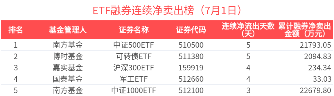 近期獲槓桿資金連續融券淨賣出的ETF基金有16只,居前的為中證500ETF(5天)、可轉債ETF(5天)、滬深300ETF(4天)、軍工ETF(4天)、中證1000ETF(3天)等,分別淨賣出2.18億元、2094.83萬元、234.34萬元、33.03萬元、2.27億元。其中,中證1000ETF近3天獲槓桿資金加速流出,近3天槓桿資金累計流出2.27億元。