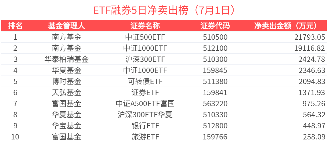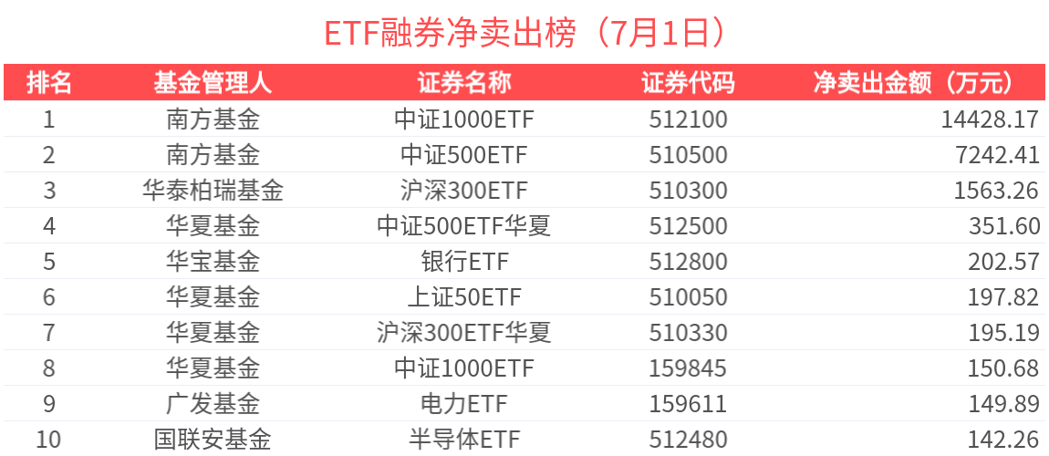 融券淨賣出金額超500萬元的有3只,中證1000ETF(512100.SH)、中證500ETF(510500.SH)、滬深300ETF(510300.SH)槓桿資金顯著流出,分別淨流出1.44億元、7242.41萬元、1563.26萬元。