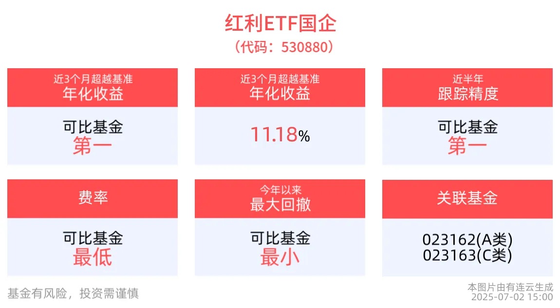 從收益能力看,截至2025年6月24日,紅利ETF國企(530880)自成立以來,最高單月回報為4.63%,最長連漲漲幅為4.63%,上漲月份平均收益率為3.70%,近3個月超越基準年化收益為6.81%,排名可比基金1/2。