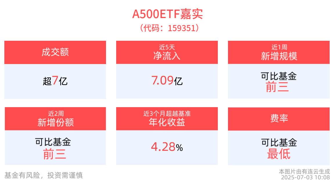 流動性方面,A500ETF嘉實盤中換手4.79%,成交7.67億元。拉長時間看,截至7月2日,A500ETF嘉實近1月日均成交30.17億元。