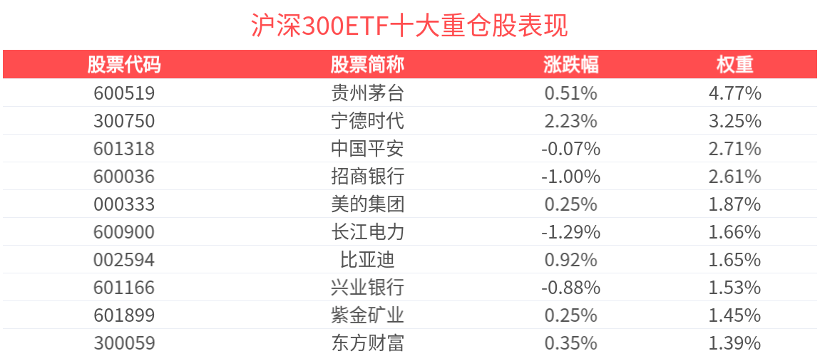 數據顯示,截至2025年6月30日,滬深300指數前十大權重股分別為貴州茅台、寧德時代、中國平安、招商銀行、興業銀行、長江電力、美的集團、紫金礦業、比亞迪、東方財富,前十大權重股合計佔比22.76%。