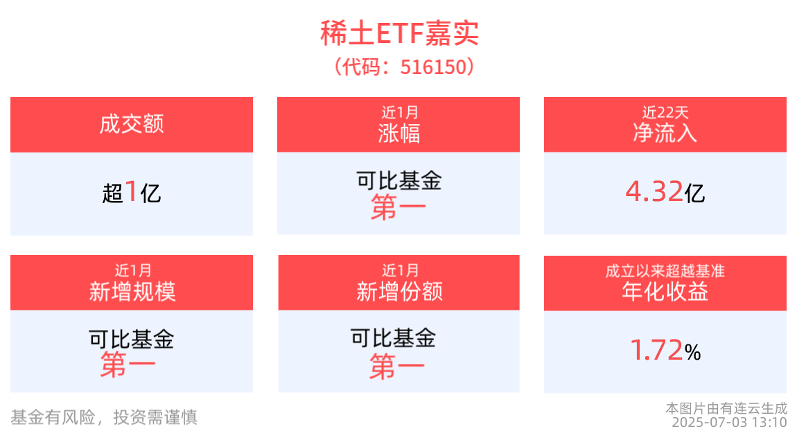 流動性方面,稀土ETF嘉實盤中換手4.2%,成交1.00億元。拉長時間看,截至7月2日,稀土ETF嘉實近1周日均成交1.44億元,排名可比基金第一。