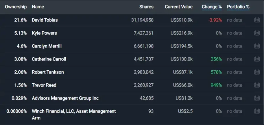 CEO David Tobias 是最大的單一股東,持有約 3120 萬股,約佔公司總股本的 22.8%。除他之外,董事 Kyle Powers、財務負責人 Carolyn Merrill、董事 Catherine Carroll、Robert Tankson 與 Trevor Reed 分別持有 160 萬至 740 萬股不等的股份,個人持股比例在 1.6% 至 5.1% 之間。