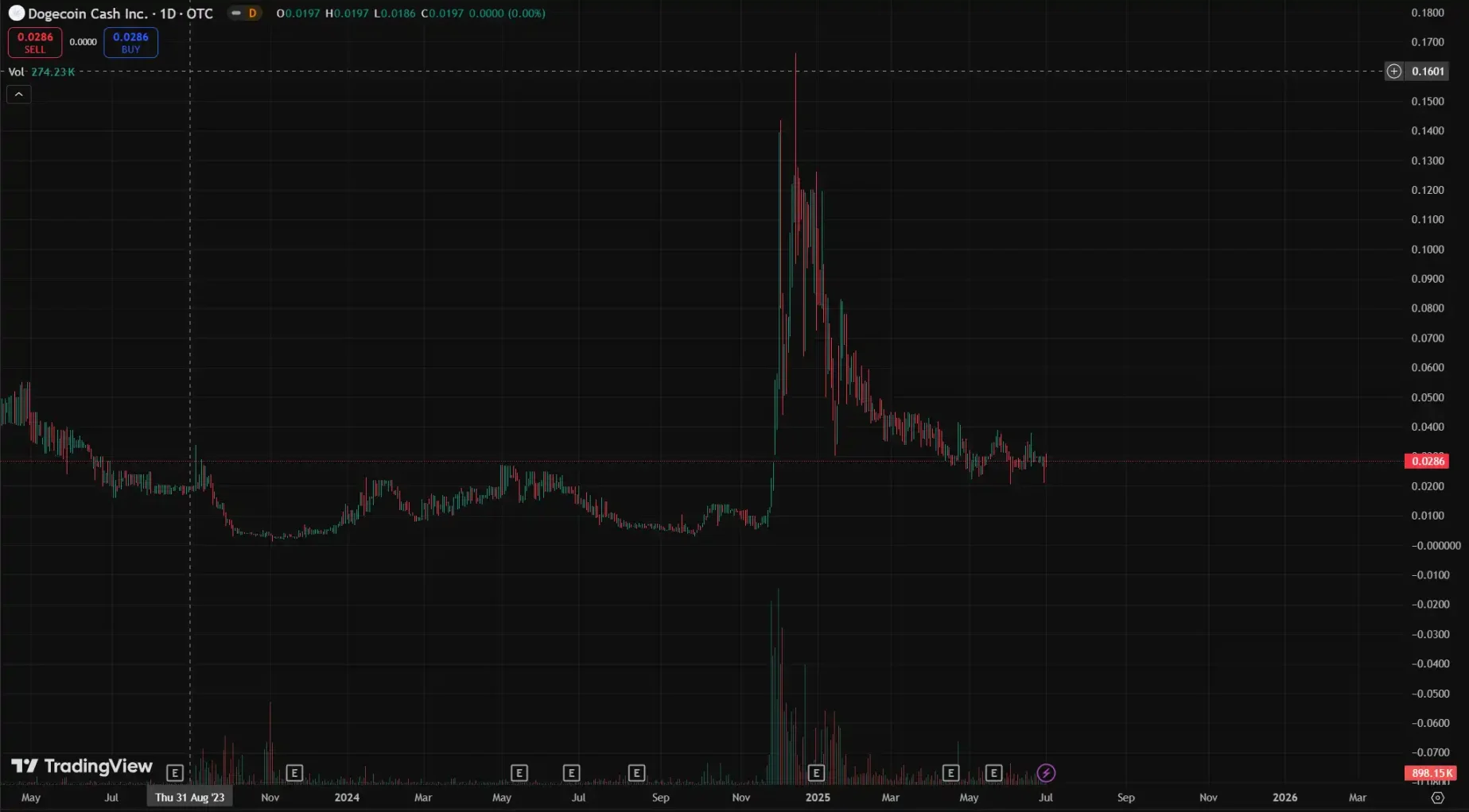 Dogecoin Cash Inc. 的股價近期進入盤整區間。截至 2025 年 7 月 1 日美股收盤,DOGP 報收於 0.0289 美元,單日跌幅 1.03%,延續近一周以來的小幅調整趨勢。自 2024 年 9 月創下 52 周低點 0.0028 美元,DOGP 累計漲幅一度超過 900%,並在 2024 年 12 月觸及年内高點 0.1662 美元。不過,進入 2025 年第二季度後,該股明顯回落,當前價格相較高點已回撤超過 80%。