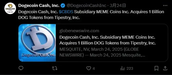 2024 年 11 月,公司正式由「Cannabis Sativa, Inc.」為「Dogecoin Cash Inc.」,並通過設立多個子公司進軍加密資産領域。