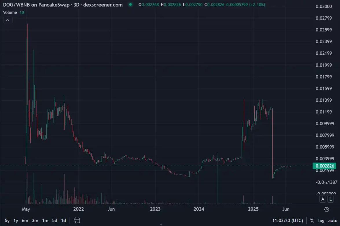 截止目前,該公司鏈上代幣 DOG 價格距離高點下跌超 80%。