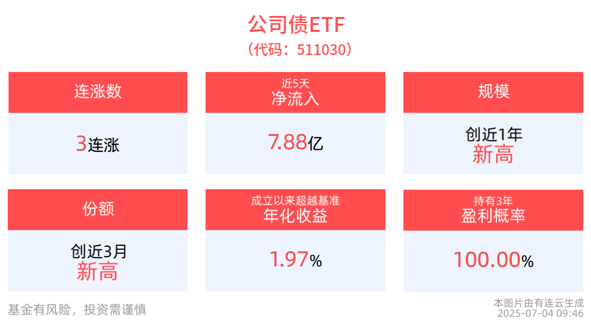 截至2025年7月4日 09:46,公司債ETF(511030)上漲0.03%, 沖擊3連漲。最新價報106.19元。拉長時間看,截至2025年7月3日,公司債ETF近1年累計上漲2.18%。