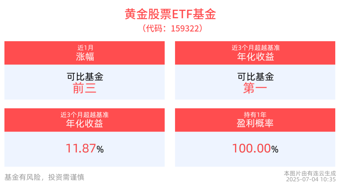 截至2025年7月4日 10:35,中證滬深港黃金産業股票指數(931238)成分股方面漲跌互現,神宇股份(300563)領漲6.82%,益民集團(600824)上漲0.00%,豫園股份(600655)上漲0.00%;赤峰黃金(06693)領跌。黃金股票ETF基金(159322)最新報價1.21元。拉長時間看,截至7月3日,黃金股票ETF基金近1年淨值上漲24.53%。
