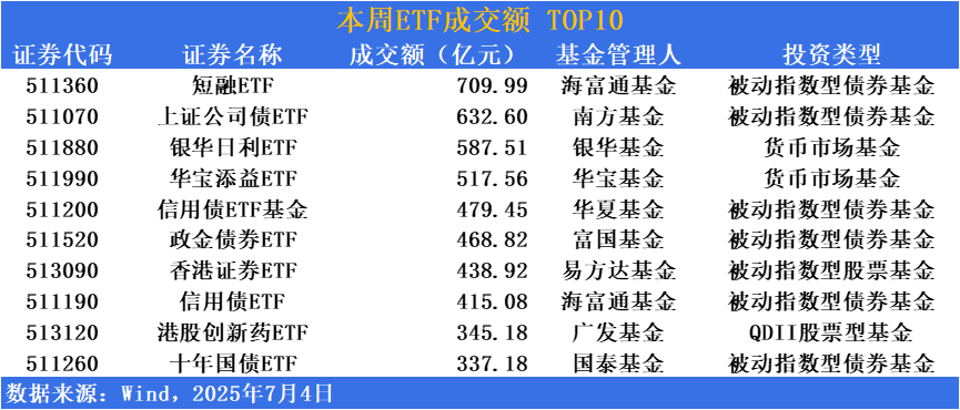 成交額方面,短融ETF(511360)周成交額達709.99億元,位居榜首。上證公司債ETF(511070)、銀華日利ETF(511880)成交額分別為632.60億元與587.51億元緊隨其後,債券類基金場内交投保持較高活躍度。