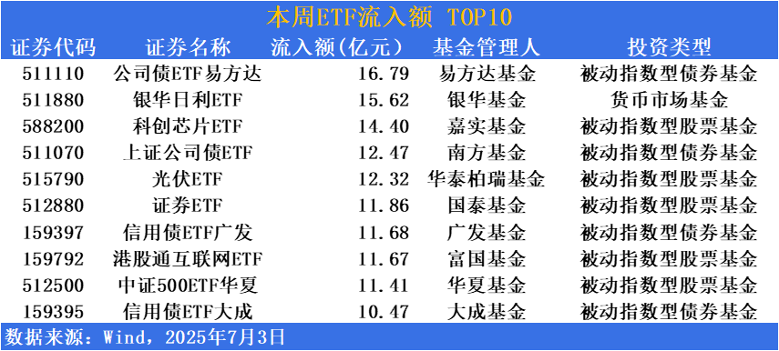 具體資金流入方面,本期(2025年6月23日-6月26日)場内資金出現分化,一方面 ETF成為流入主力,公司債ETF易方達(511110)、銀華日利ETF(511880)等債券ETF流入超15億,整體流入趨勢明顯。另一方面,高成長賽道也迎來了資金回流,科創芯片 ETF(588200)、光伏ETF(515790)、港股通互聯網ETF(159792)等成長類ETF産品流入同樣可觀。