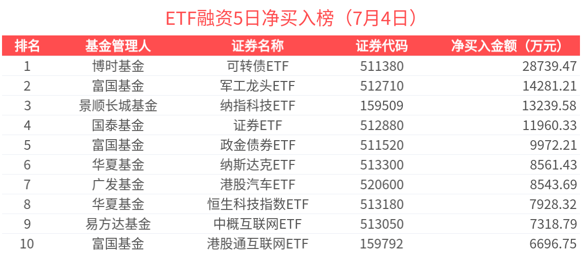 2025年7月4日,共204只ETF基金獲融資淨買入,27只ETF基金融券淨賣出。融資淨買入金額超500萬元的有36只,黃金ETF(518880.SH)、可轉債ETF(511380.SH)、恒生科技指數ETF(513180.SH)、政金債券ETF(511520.SH)、黃金ETF基金(159937.SZ)槓桿資金顯著流入,分別淨流入5122.96萬元、4944.01萬元、2989.15萬元、2610.76萬元、2574.96萬元。