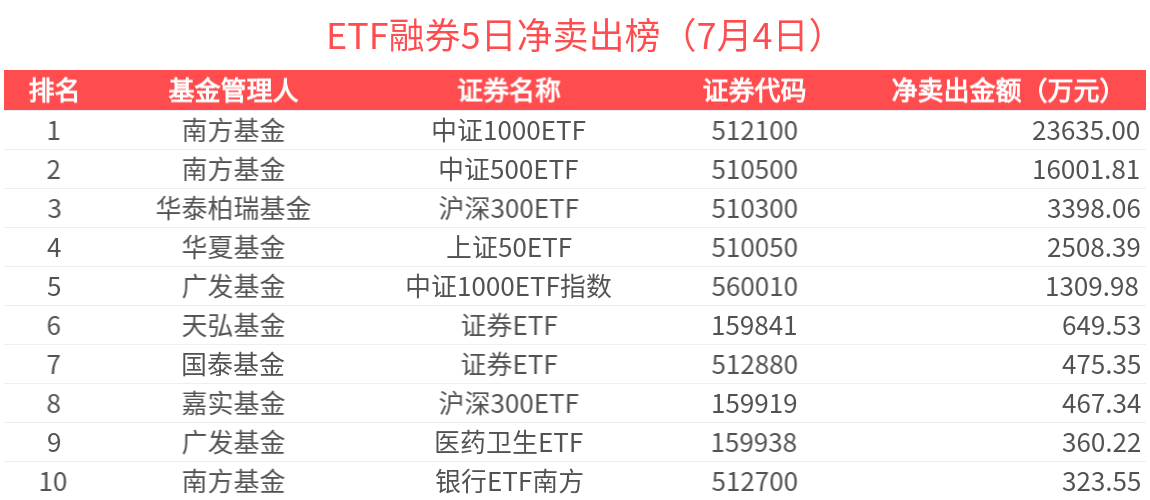 融券淨賣出金額超500萬元的有3只,中證1000ETF(512100.SH)、上證50ETF(510050.SH)、中證1000ETF指數(560010.SH)槓桿資金顯著流出,分別淨流出6301.38萬元、1446.53萬元、1238.93萬元。