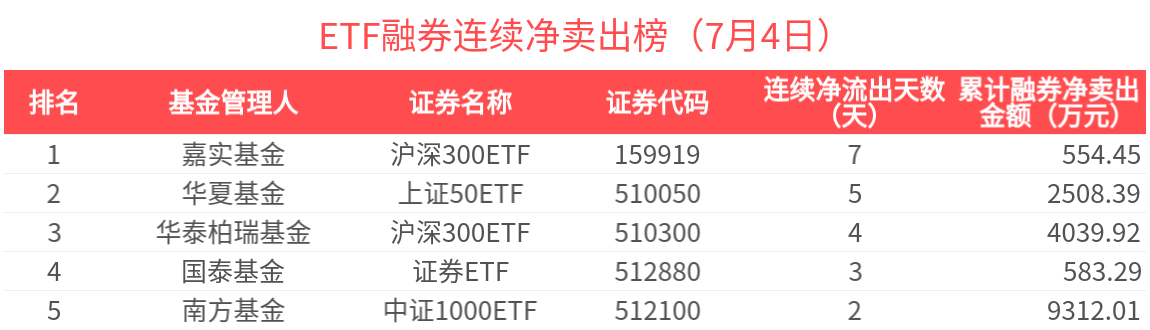 近期獲槓桿資金連續融券淨賣出的ETF基金有11只,居前的為滬深300ETF(7天)、上證50ETF(5天)、滬深300ETF(4天)、證券ETF(3天)、中證1000ETF(2天)等,分別淨賣出554.45萬元、2508.39萬元、4039.92萬元、583.29萬元、9312.01萬元。其中,中證1000ETF近2天獲槓桿資金加速流出,近2天槓桿資金累計流出9312.01萬元。