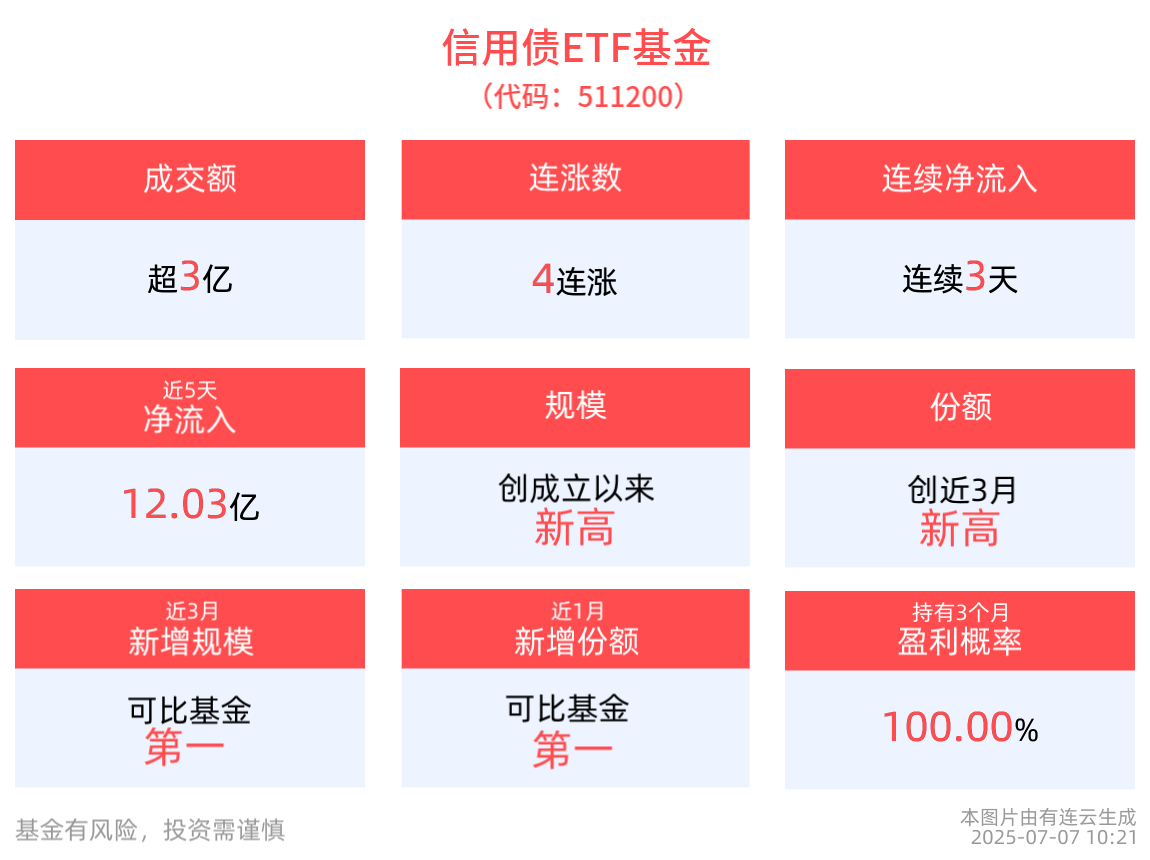 截至2025年7月7日10:21,信用債ETF基金(511200)上漲0.05%, 沖擊4連漲,最新價報101.45元。流動性方面,截至7月4日,信用債ETF基金近1周日均成交95.89億元。