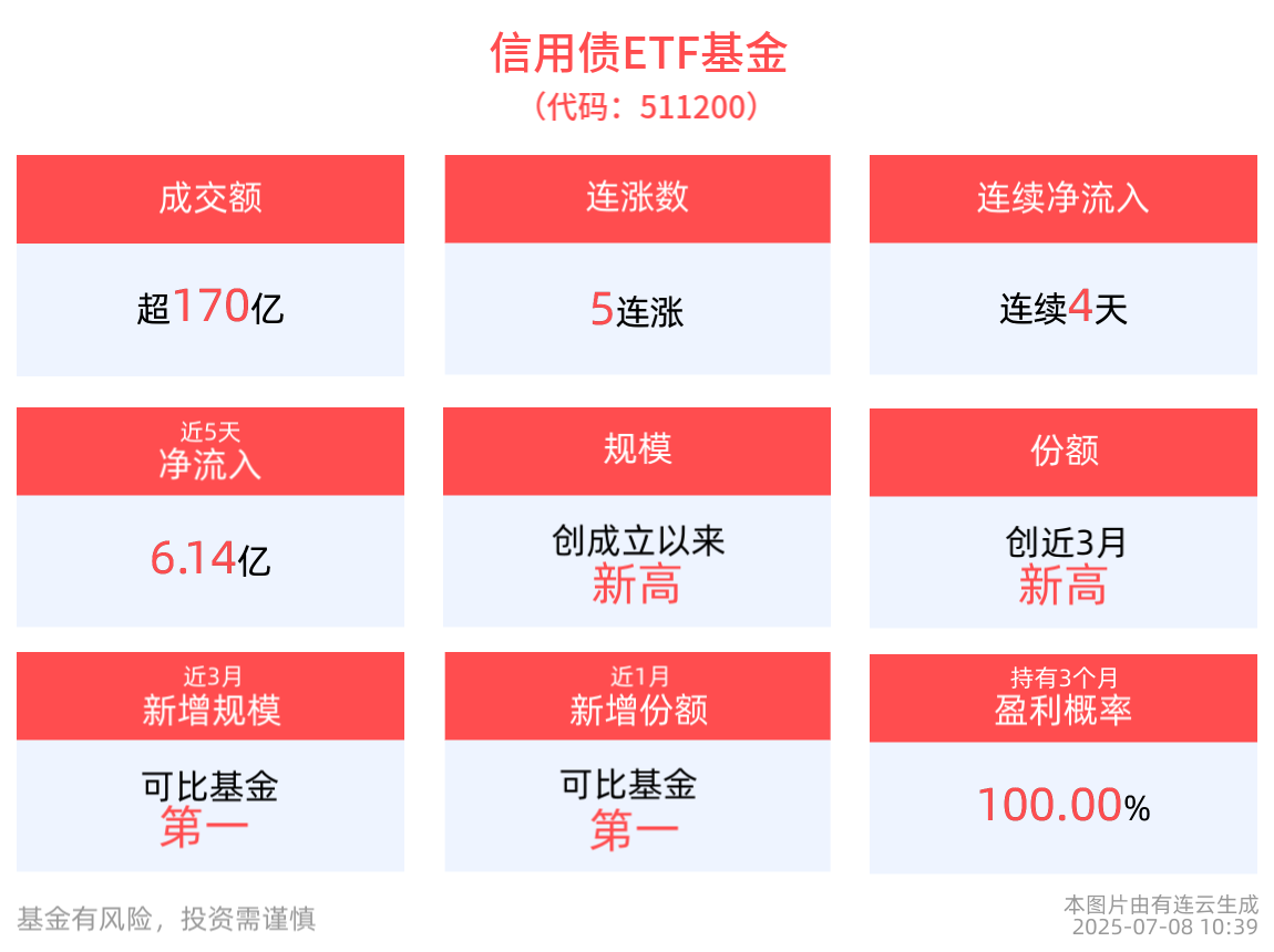 從資金淨流入方面來看,信用債ETF基金近4天獲得連續資金淨流入,最高單日獲得3.70億元淨流入,合計「吸金」6.14億元,日均淨流入達1.54億元。規模方面,信用債ETF基金最新規模達222.84億元,創成立以來新高。