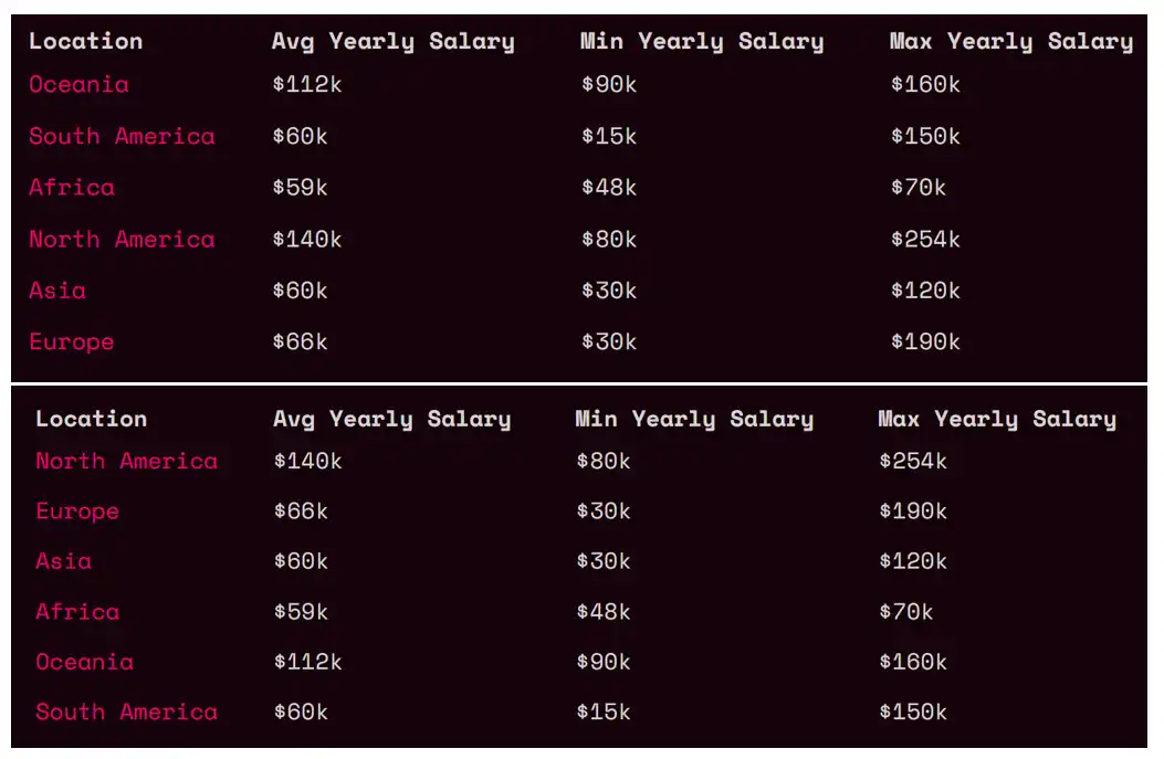 圖為 Web3 非技術崗位(上圖)與技術崗位(下圖)按地區劃分的年均薪資情況