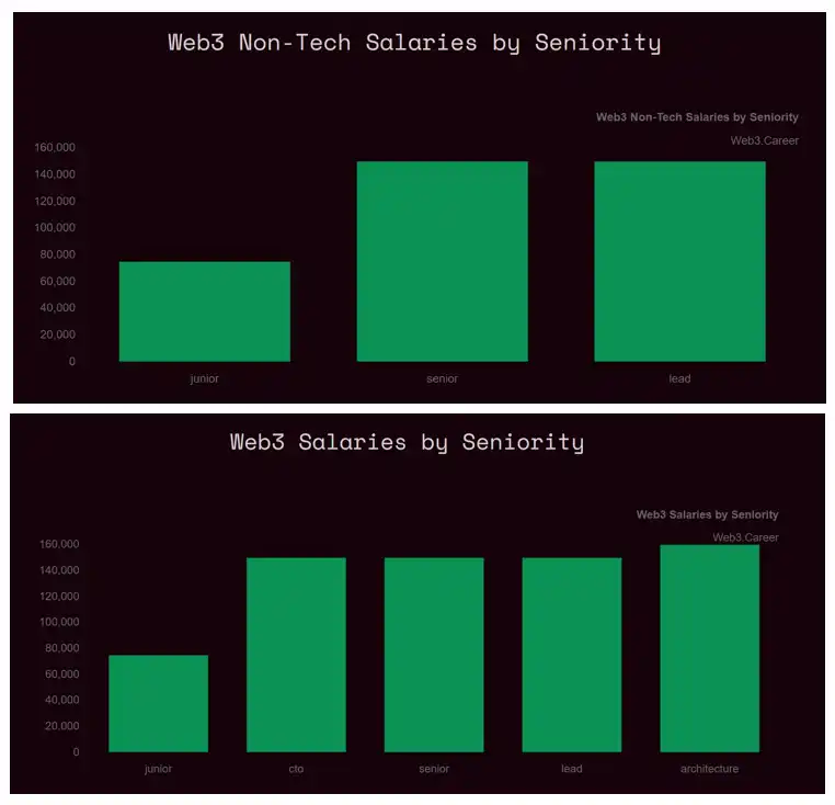 圖為 Web3 非技術崗位(上圖)與技術崗位(下圖)在不同資歷水平下的全球薪資區間