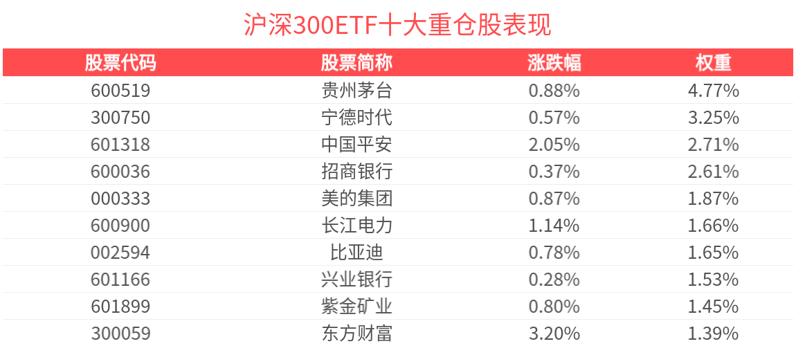 數據顯示,截至2025年6月30日,滬深300指數前十大權重股分別為貴州茅台、寧德時代、中國平安、招商銀行、興業銀行、長江電力、美的集團、紫金礦業、比亞迪、東方財富,前十大權重股合計佔比22.76%。