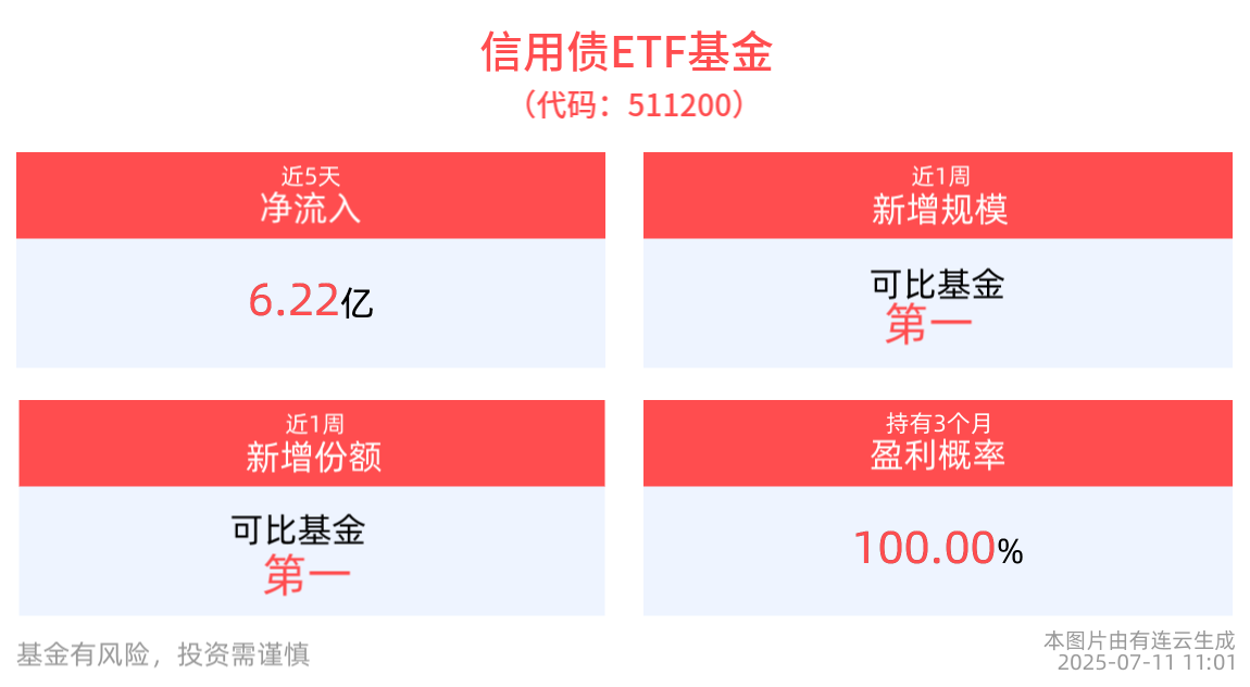 截至2025年7月11日11點整,信用債ETF基金(511200)多空膠著,最新報價101.2元。流動性方面,截至7月10日,信用債ETF基金近1周日均成交97.79億元,排名可比基金第一。