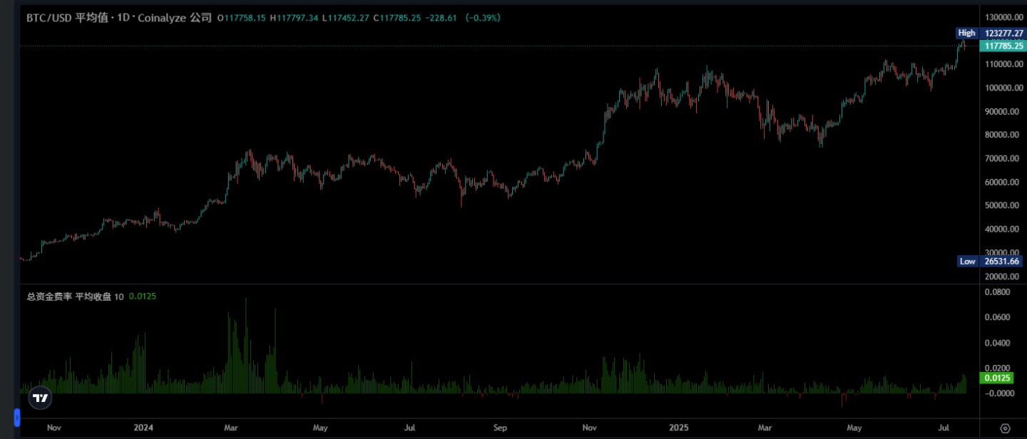 比特幣期權未平倉合約 此外,比特幣永續合約的資金費率保持在低水平。Coinalyze 數據顯示,當前日均資金費率為 0.01%,遠低於去年突破前高 6.9 萬美元時候的最高 0.08% 峰值和去年年底首次突破 10 萬美元時的 0.04%。低水平的資金費率反映的迹象是市場投機需求相比以往大幅減少。